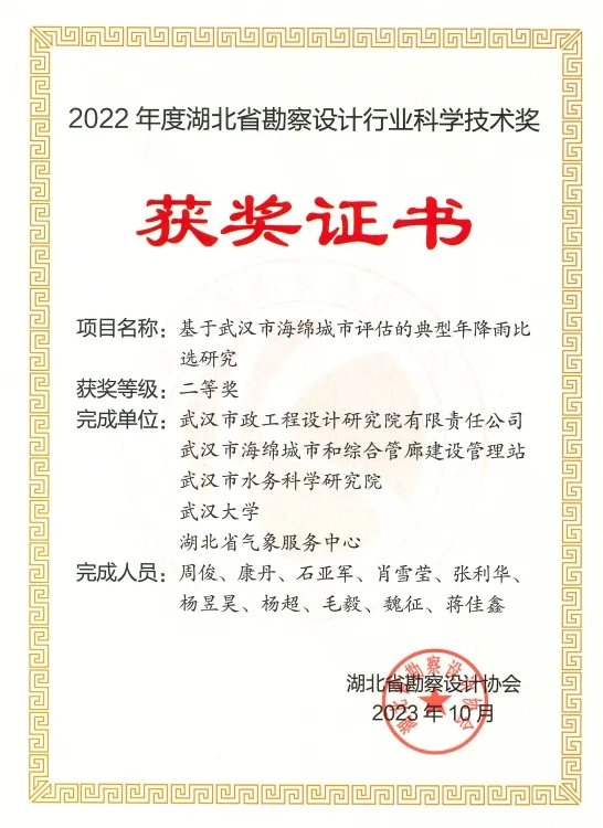 依托“城市內澇防治與水環境流域治理技術中試平臺”開展的《基于武漢市海綿城市評估的典型年降雨比選研究》獲湖北省勘察設計協會科學技術二等獎