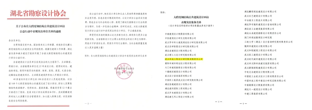 近日,湖北省勘察設(shè)計協(xié)會發(fā)布《關(guān)于公布在大跨度鋼結(jié)構(gòu)公共建筑設(shè)計回訪公益行動中表現(xiàn)突出單位名單的通報》,武漢市政院憑借高度的社會責任感與卓越的專業(yè)貢獻,榮列通報表揚名單,成為全省勘察設(shè)計行業(yè)的標桿典范。