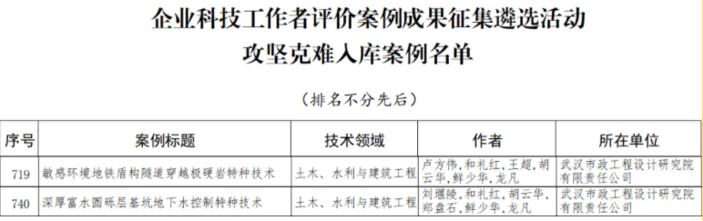 ? ? ?2025年6月4日,中國科協發布了《關于企業科技工作者評價案例成果征集遴選活動結果的通知》,公布了《企業科技工作者評價案例庫》,其中攻堅克難案例843項、成果轉化案例726項。武漢市政院巖土博士創新工作室申報的“敏感環境地鐵盾構隧道穿越極硬巖特種技術”、“深厚富水圓礫層基坑地下水控制特種技術”兩項攻堅克難案例與技術均成功入庫。