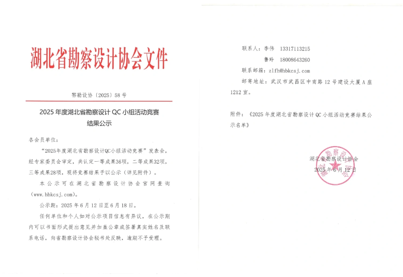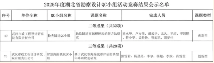 武漢市政院再傳捷報!近日,湖北省勘察設計協會組織召開的“2025 年度湖北省勘察設計QC小組活動競賽”中,武漢市政院選送的兩個QC小組表現亮眼:地空事業部"拾光隧道QC小組"憑借創新成果斬獲競賽二等獎,規劃研究事業部"智慧海綿領航QC小組"榮獲三等獎佳績。