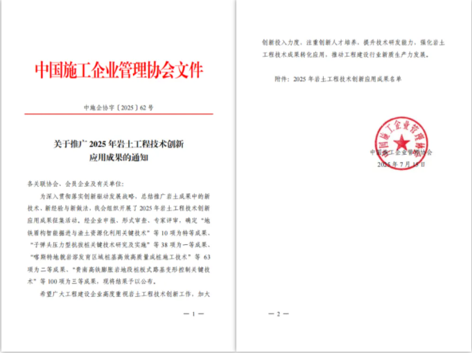 ? ? 近日,中國施工企業管理協會2025年巖土工程技術創新應用成果結果正式揭曉。經過企業申報、形式審查、專家評審等多個環節遴選,武漢市政院巖土博士創新工作室申報的“深厚富水圓礫層基坑地下水控制特種技術”、“敏感環境地鐵盾構隧道穿越極硬巖特種技術”等2項技術創新性顯著,獲評為三等成果。
