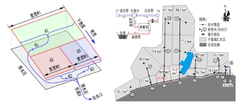 地塊產(chǎn)流原理圖(左)和排水管網(wǎng)概化圖(右)