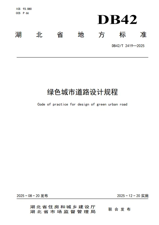 ? ? 近日,由武漢市政院主持編制的湖北省《綠色城市道路設計規程》(DB42/T 2419-2025)地方標準,經湖北省住房和城鄉建設廳、湖北省市場監督管理局聯合批準發布,將于2025年12月20日起正式實施。該標準是公司聯合行業多家單位,歷時三年深入調研國內典型城市綠色道路建設實踐,系統總結湖北省實踐經驗的重要成果。