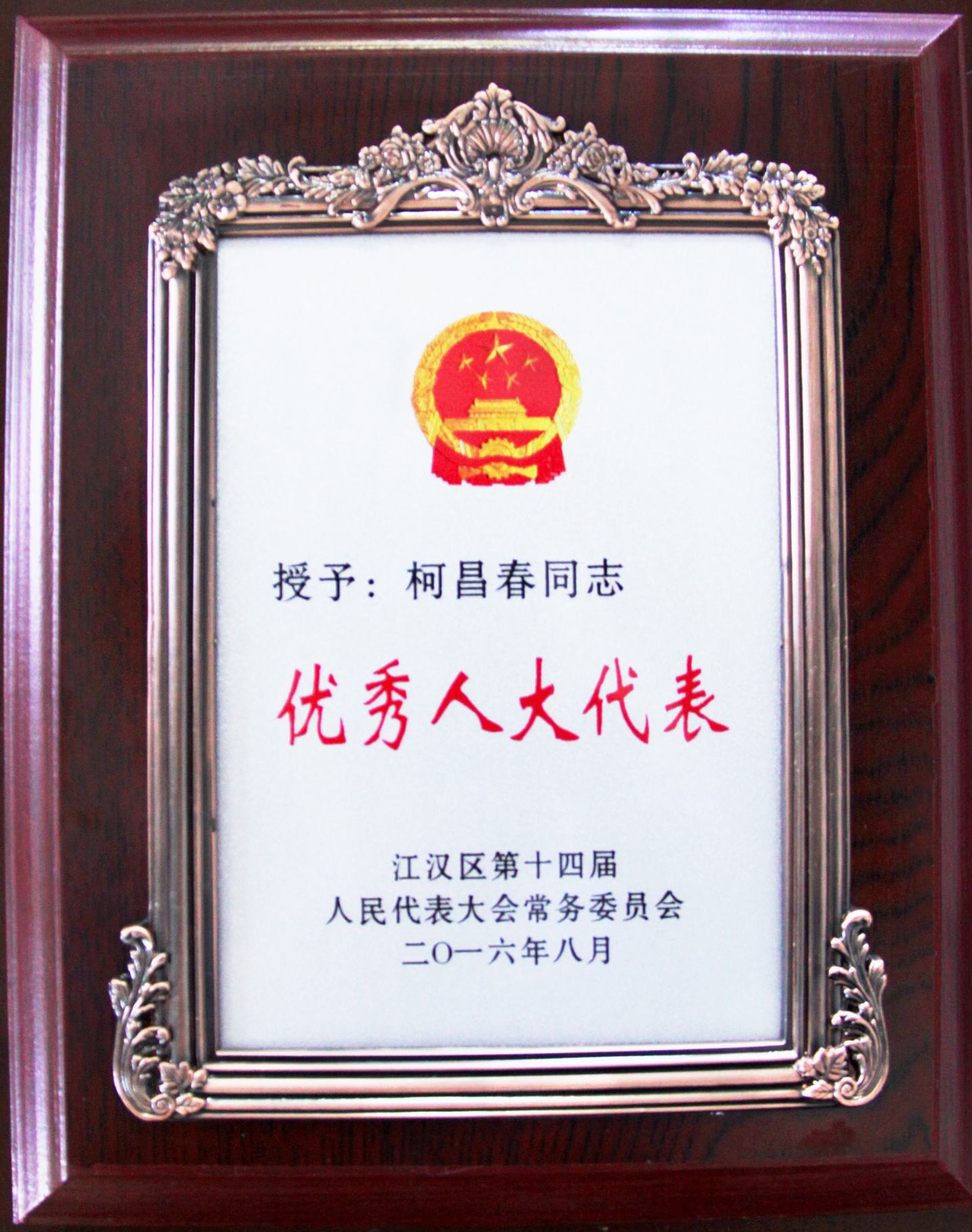 ??? 近日,一則喜報從江漢區(qū)人大傳來,公司董事長柯昌春同志在擔任江漢區(qū)人大代表期間積極為江漢區(qū)的建設和發(fā)展建言獻策,被江漢區(qū)人大授予“優(yōu)秀人大代表”榮譽稱號。