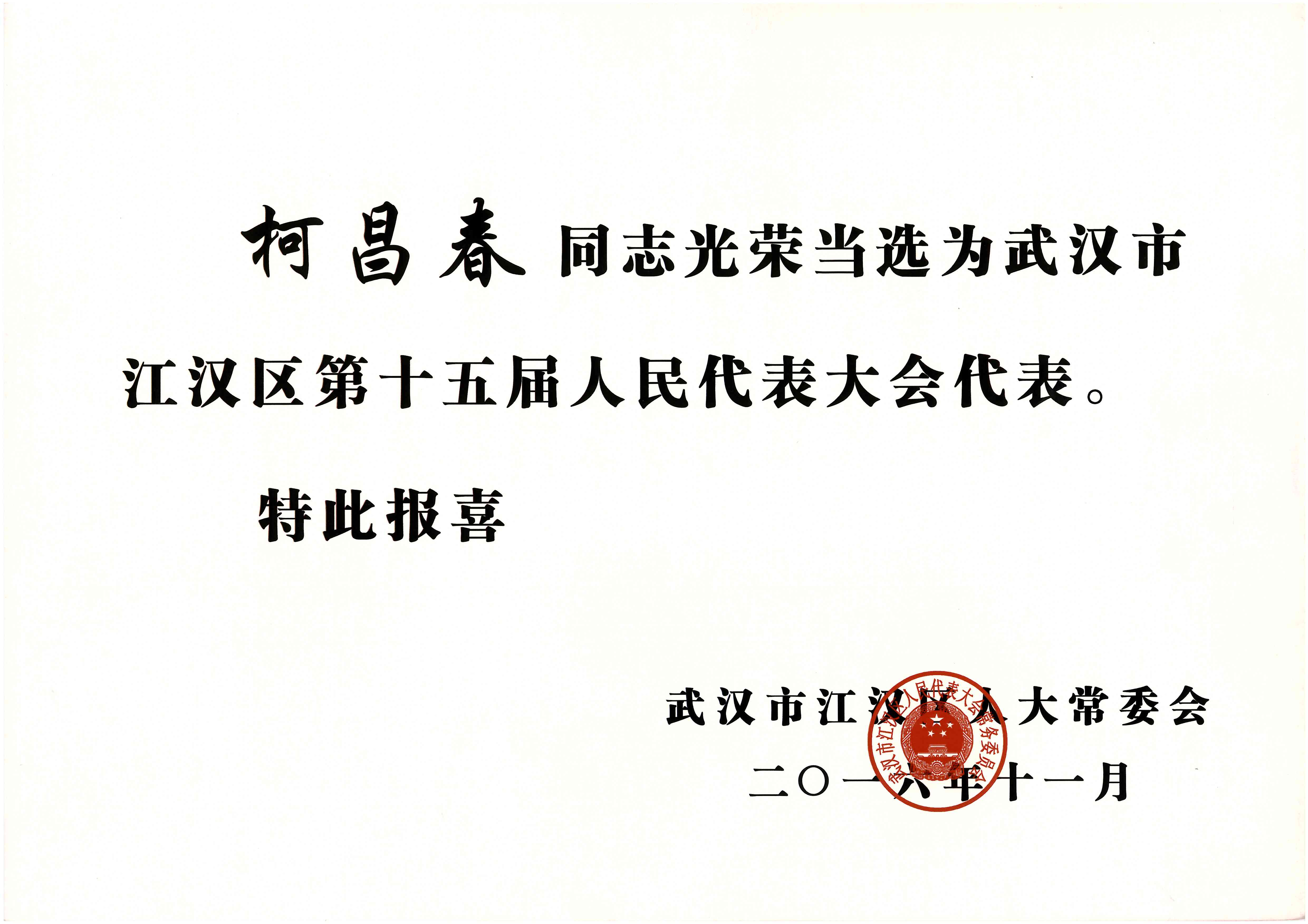 ??? 11月10日,江漢區進行了人大代表選舉,依法選舉產生了第十五屆人民代表大會代表,后經江漢區人大常委會確認,公司董事長柯昌春同志光榮當選為江漢區第十五屆人民代表大會代表。這也是他連續第二次當選為江漢區人大代表。