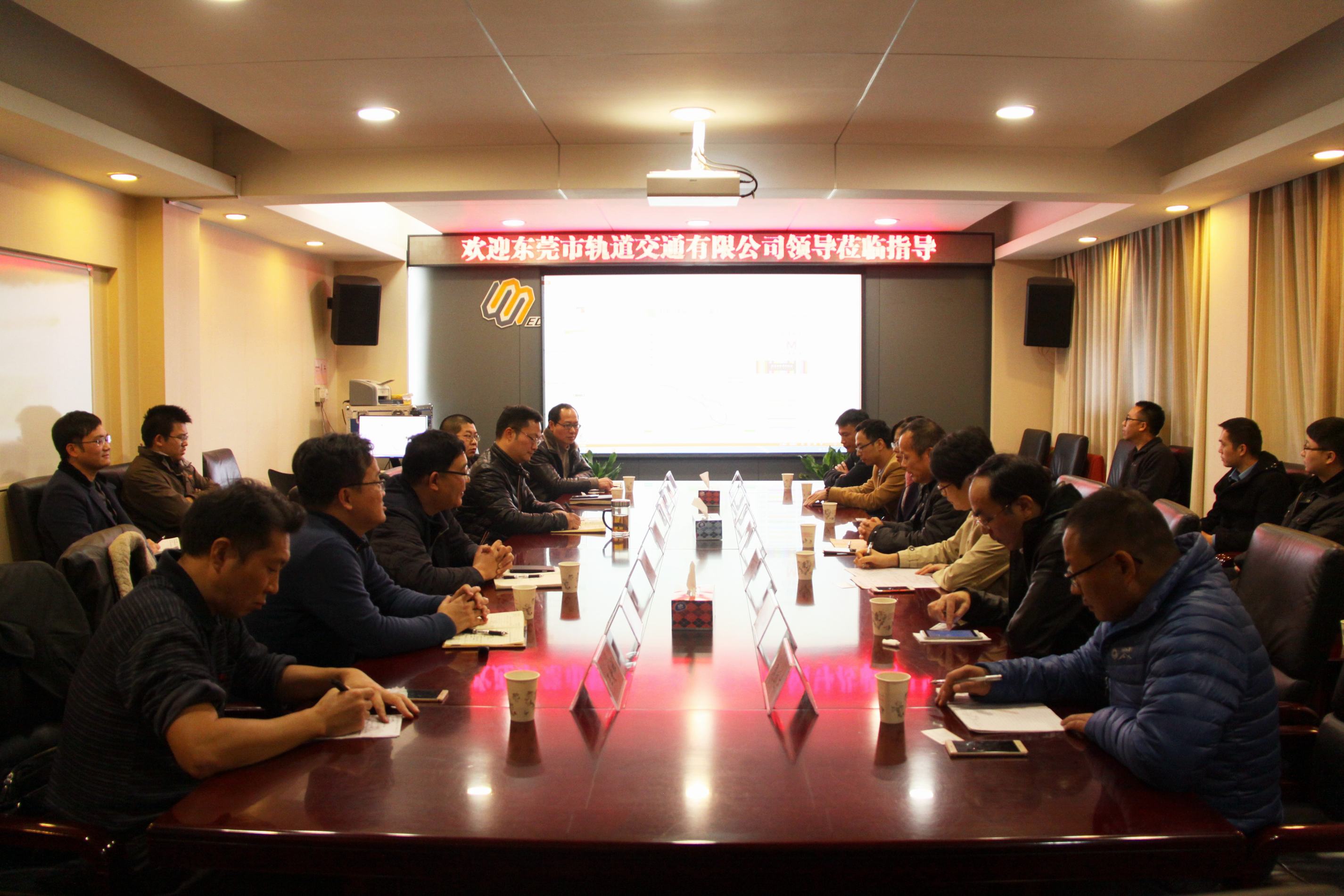 ??? 12月22日下午,東莞市軌道交通有限公司工程部部長王小忠、黨群部部長盧利清等一行10人蒞臨公司考察指導,公司副總經理陳建斌、總經理助理郝建強以及相關部門負責人及技術人員參加了座談。