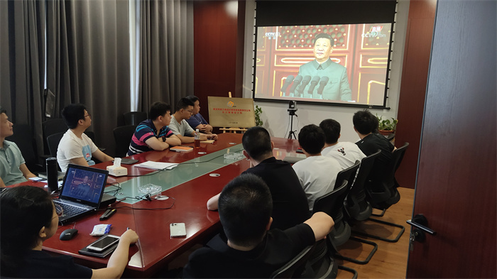 公司領導、總經理助理、駐總院辦公的部門負責人、支部書記在西四樓會議室集中收看大會盛況。大會伊始,在轟鳴的禮炮聲中,國旗護衛隊護衛國旗颯爽登場;全場肅立高唱《國歌》,高亢的旋律瞬間營造了莊嚴肅穆的氛圍;少先隊員和共青團聯合獻詞,回顧黨的光輝歷史,表達對黨的熱愛與忠誠。大會現場氣氛莊嚴,激昂奮進,讓收看的人仿佛置身現場,親臨盛典。