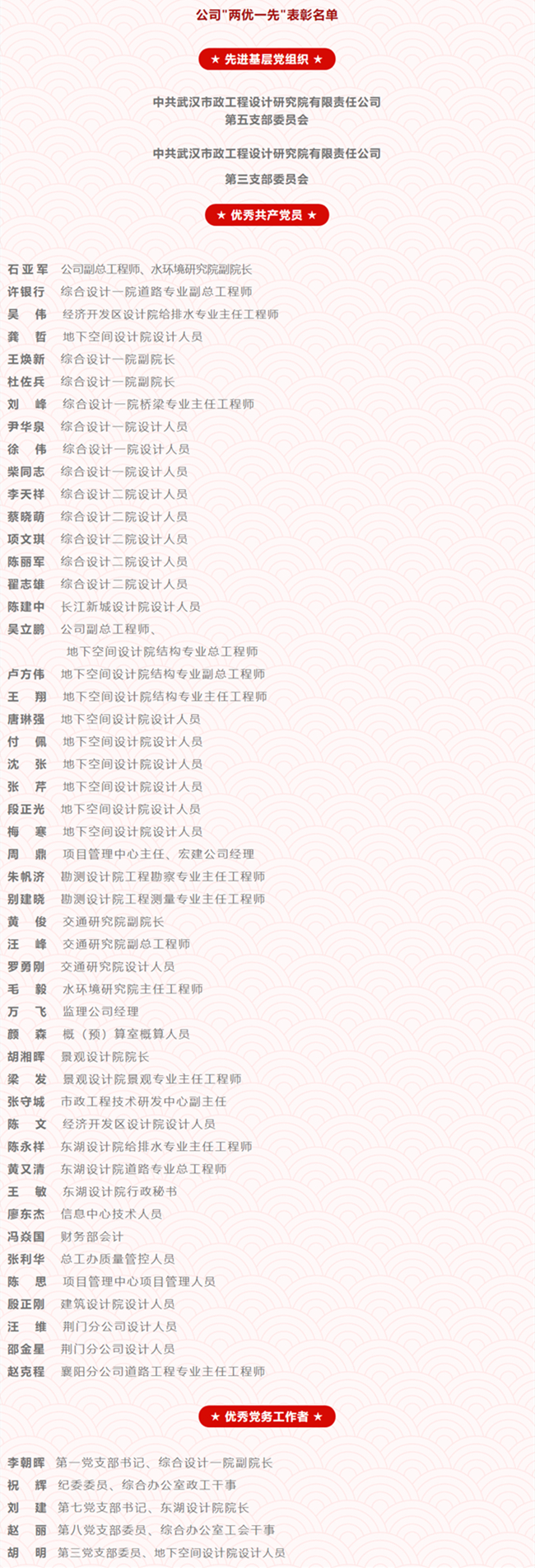 公司綜合設計一院道路專業副總工程師許銀行、經濟開發區設計院給排水專業主任工程師吳偉、地下空間設計院設計人員龔哲榮獲市城投集團公司“優秀共產黨員”稱號;