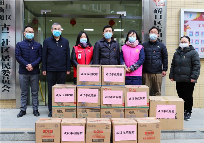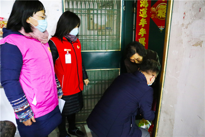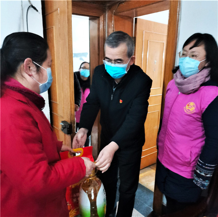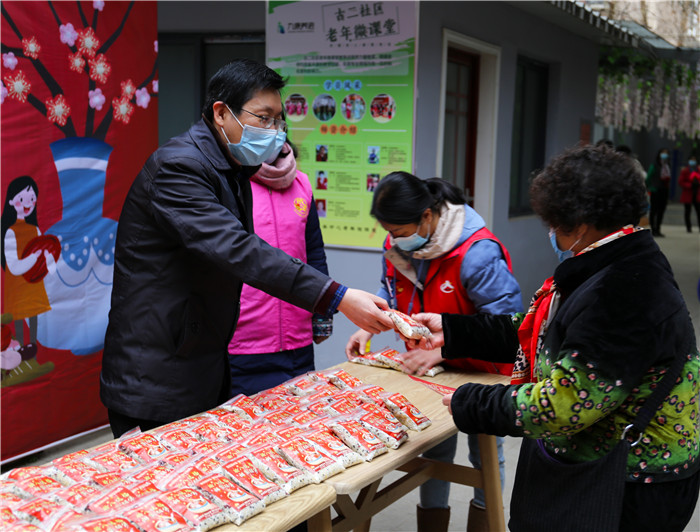 慰問期間,恰逢社區正在開展“臘八送福·甜蜜相伴”活動,談逢陽一行也加入其中,熱情地為前來的社區居民發放臘八米,送上殷切的節日祝福,叮囑他們要做好防護。
