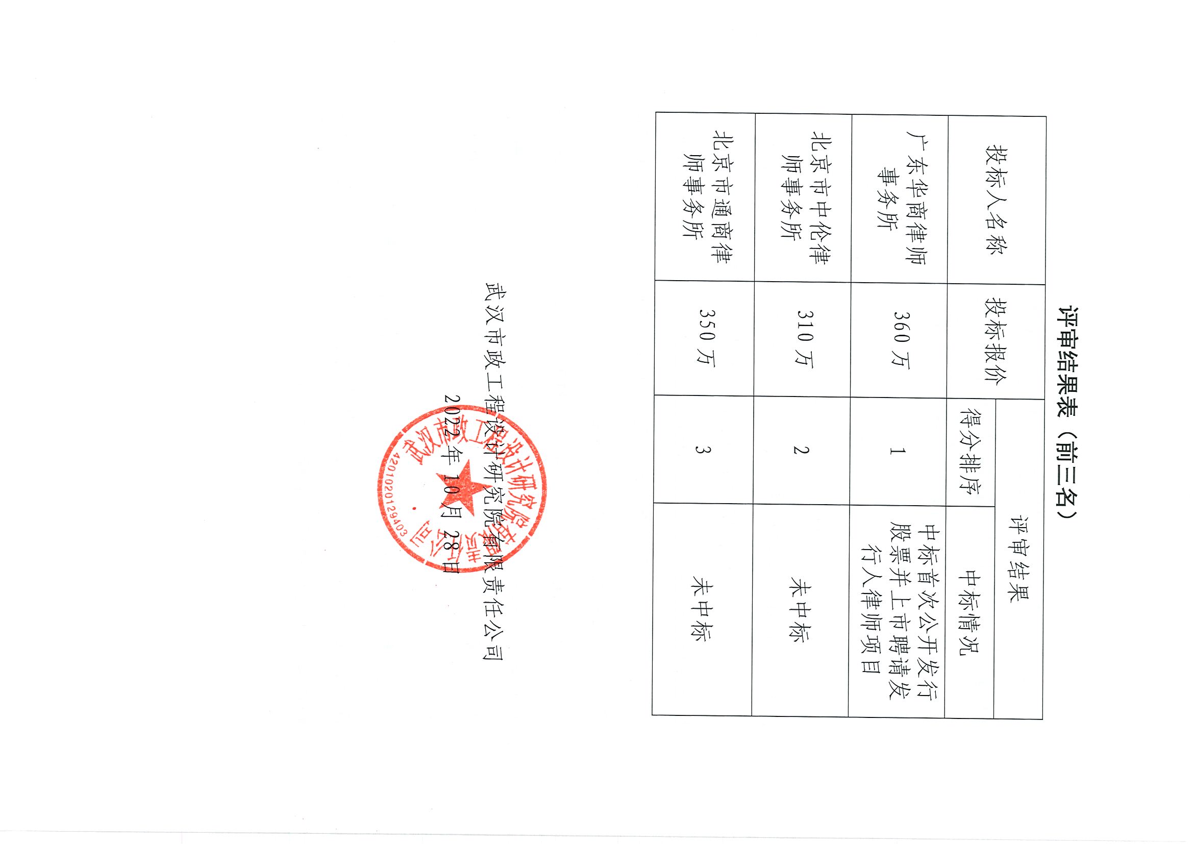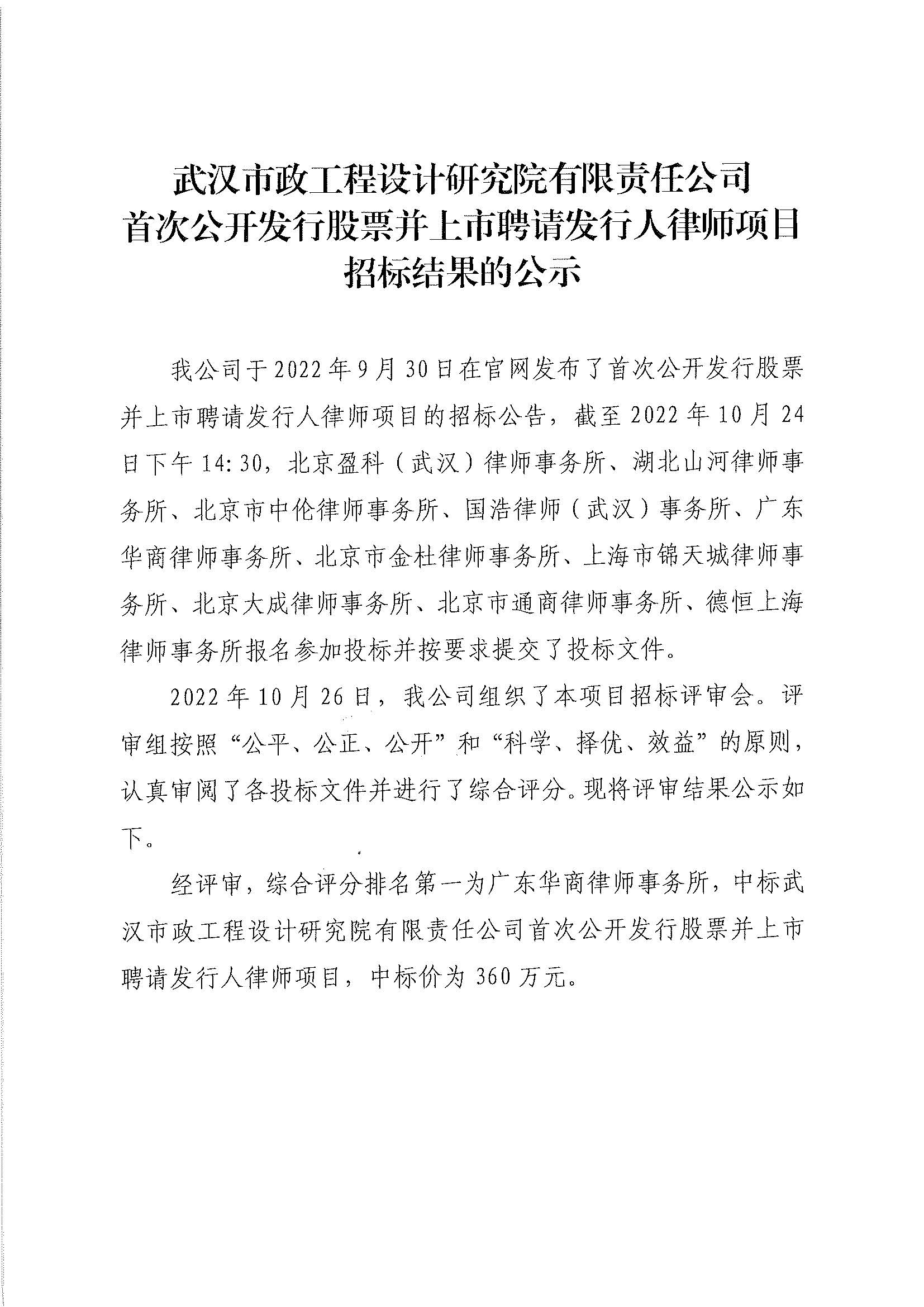 武漢市政工程設計研究院有限責任公司首次公開發行股票并上市聘請發行人律師項目招標結果的公示
