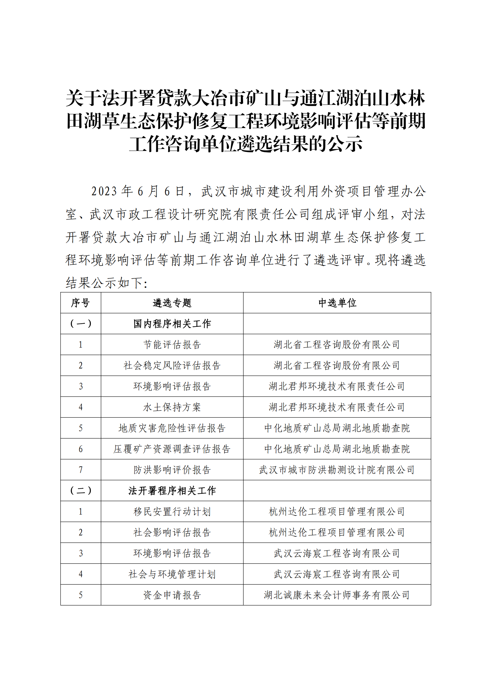 關(guān)于法開署貸款大冶市礦山與通江湖泊山水林田湖草生態(tài)保護(hù)修復(fù)工程環(huán)境影響評(píng)估等前期工作咨詢單位遴選結(jié)果的公示