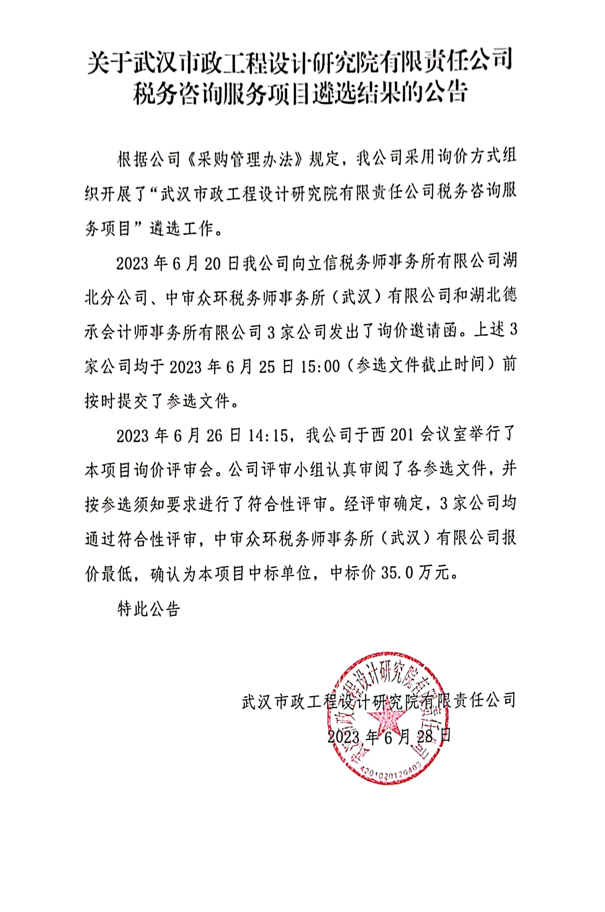 關于武漢市政工程設計研究院有限責任公司稅務咨詢服務項目遴選結果的公告